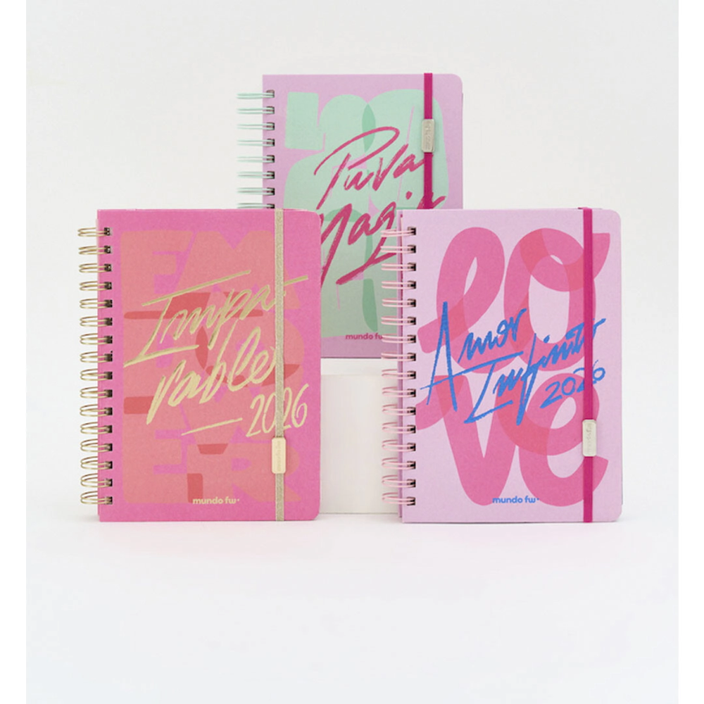 Agenda con vista diaria, hoja de información personal, calendario 2026-2027, feriados internacionales, ideas y proyectos, lugares para visitar, libros para leer, notas, planner anual y mensual, gastos mensuales y caratulas, dos planchas de stickers, sobre y troquel para señalar hojas, charm, elastico y cinta señaladora. Papel de 80 gr bookcel. Filo de hojas a color.