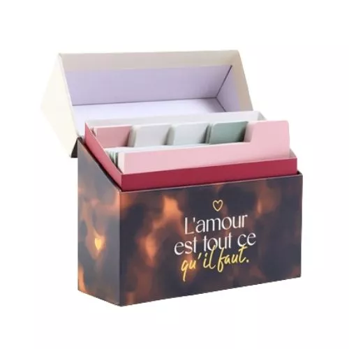 Fichero de cartón, detalles en stamping. Con 5 juegos de tarjetas, 20 fichas por color escalonadas. Son 100 hojas de 220 grs.
