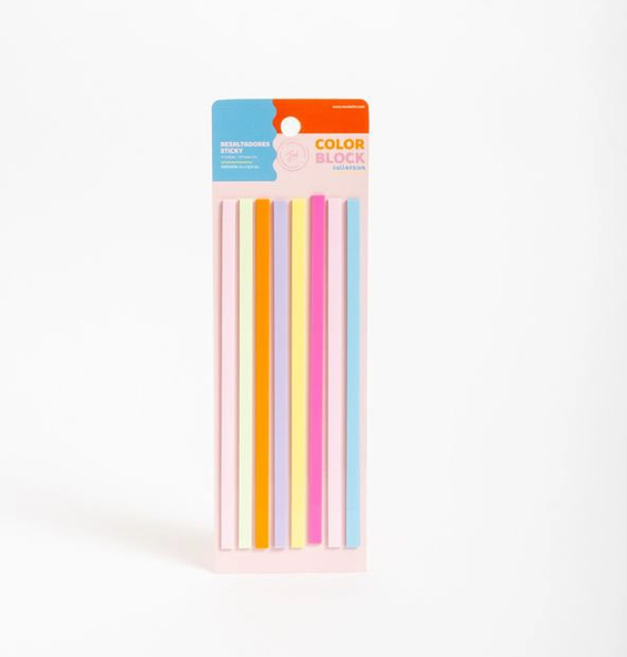 Tiras resaltadoras autoadhesivas. Incluye 6 piezas de color con 20 hojas cada una. Tamaño 14 x 0.5 cm. Ideales para marcar, organizar y resaltar texto fácilmente.