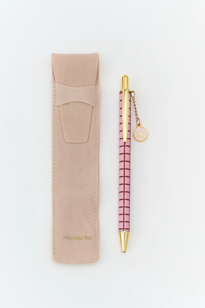 Bolígrafo retráctil con tinta azul con charms dorados. Incluye funda de velvet para un toque elegante y sofisticado.