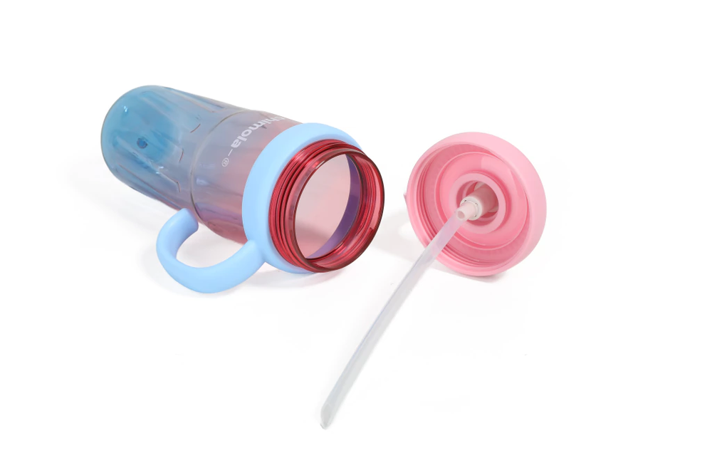 Botella plástica con manija, tapa rosca y boquilla con válvula. Cuerpo: plástico AS transparente con efecto degradé, libre de BPA. Tapa: PP con rosca y boquilla de silicona con válvula antiderrame. Manija lateral ergonómica para mayor comodidad. Tapa con loop flexible para transportar o colgar fácilmente. Apta para bebidas frías o a temperatura ambiente (no calientes).