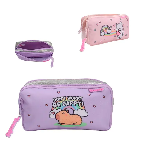 ‘-Color: Lila y Rosa. -Material: 100% Poliéster. -Medidas: Alto 12 cm x Ancho 22 cm x Profundidad 7 cm. -Contiene doble compartimento.