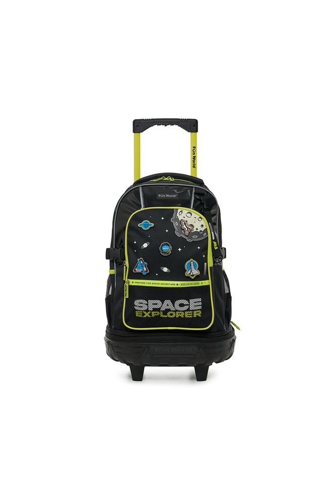 Mochila con carro 18” Space Con diseño moderno y detalles únicos, combina funcionalidad y estilo. Incluye parches de goma con velcro intercambiables, tinta que brilla en la oscuridad, bolsillo frontal con red y cierre impreso, además de varios bolsillos y compartimentos. Cuenta también con bolsillo lateral para colocar la botella. El carro es desmontable y reforzado, con dos pares de ruedas dobles que garantizan mayor resistencia y estabilidad en cada uso. Ideal para acompañar a los niños cada día con comodidad y diversión.