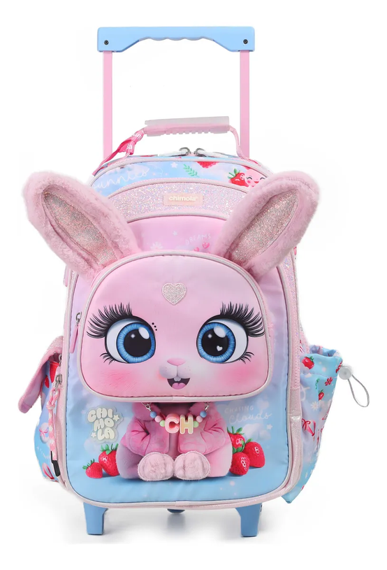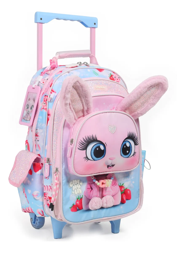 Esta mochila se destaca por sus orejitas peluditas de poodle y sus detalles glitter que la hacen única. Tiene 3 compartimentos principales y un bolsillo frontal amplio para organizar todo con comodidad. Está confeccionada en tela impermeable y resistente, ideal para el día a día. Los pullers de goma con el personaje le suman onda, y sus bolsillos laterales —uno con solapa y otro ajustable— son perfectos para llevar la botella siempre a mano. Incluye un tag personalizado del personaje para anotar tus datos. Todo pensado para que combines estilo y funcionalidad en una mochi con mucha actitud. Su carro reforzado con ruedas de silicona asegura un andar cómodo, y las correas acolchadas permiten llevarla también como mochila. Composición: Body: 90% nylon, 10% PU