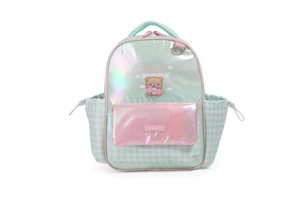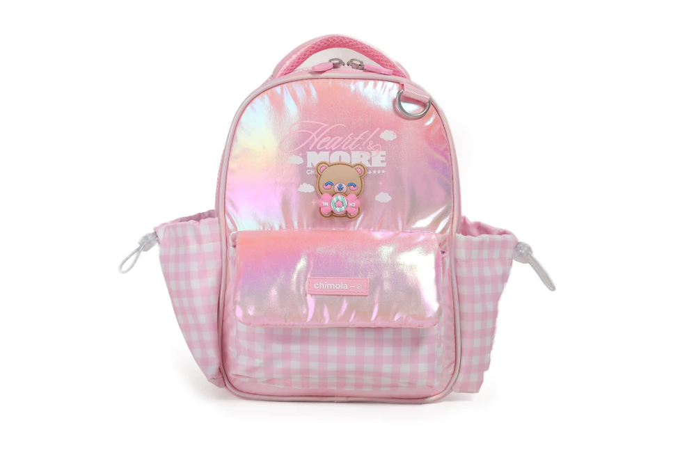 La mochi más dulce y soñadora llegó para robarse todas las miradas. Su diseño brillante con efecto tornasol y detalles de vichy rosa la convierten en una opción súper tierna. El frente tiene un adorable osito 3D que suma personalidad y ternura. Además, es liviana, compacta y cuenta con bolsillos laterales prácticos para el día a día.