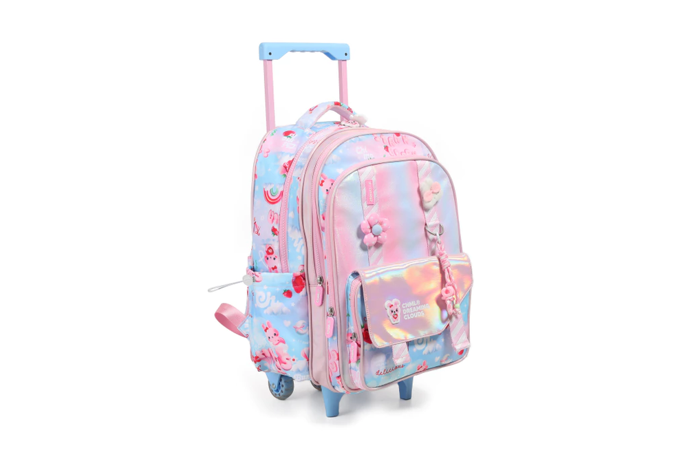 ¡Prepárate para brillar en el cole con esta mochila de carro que es pura diversión! Es súper cómoda para llevar todos tus útiles, tiene tres compartimientos súper amplios, más dos bolsillos a los costados para que lleves tu botella. Imagina esto en tu mochi: ¡Charms que bailan! Tus pasos se llenarán de magia con los charms más lindos que cuelgan y se mueven con vos.