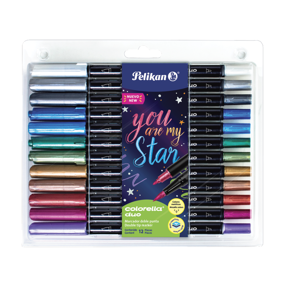 El 'Pelikan Colorella Duo Pincel - Marcador Doble Punta Metálico' es una herramienta versátil y creativa que te permitirá explorar tu talento artístico. Con su diseño de doble punta, podrás alternar entre un pincel y una punta fina, lo que facilita la creación de trazos tanto delicados como audaces. Su tinta pigmentada metálica a base de agua es ideal para lettering y se destaca en superficies oscuras, brindando un acabado brillante y atractivo. Este set incluye 12 marcadores en colores metálicos, todos no tóxicos, lo que los convierte en una opción segura para artistas de todas las edades. Su cuerpo de plástico y su presentación en estuche plástico aseguran durabilidad y comodidad en su uso. Además, son perfectos para trabajar en diversas superficies como cartón, papel, vidrio y látex, lo que amplía tus posibilidades creativas. ¡Deja volar tu imaginación con estos fantásticos marcadores!
