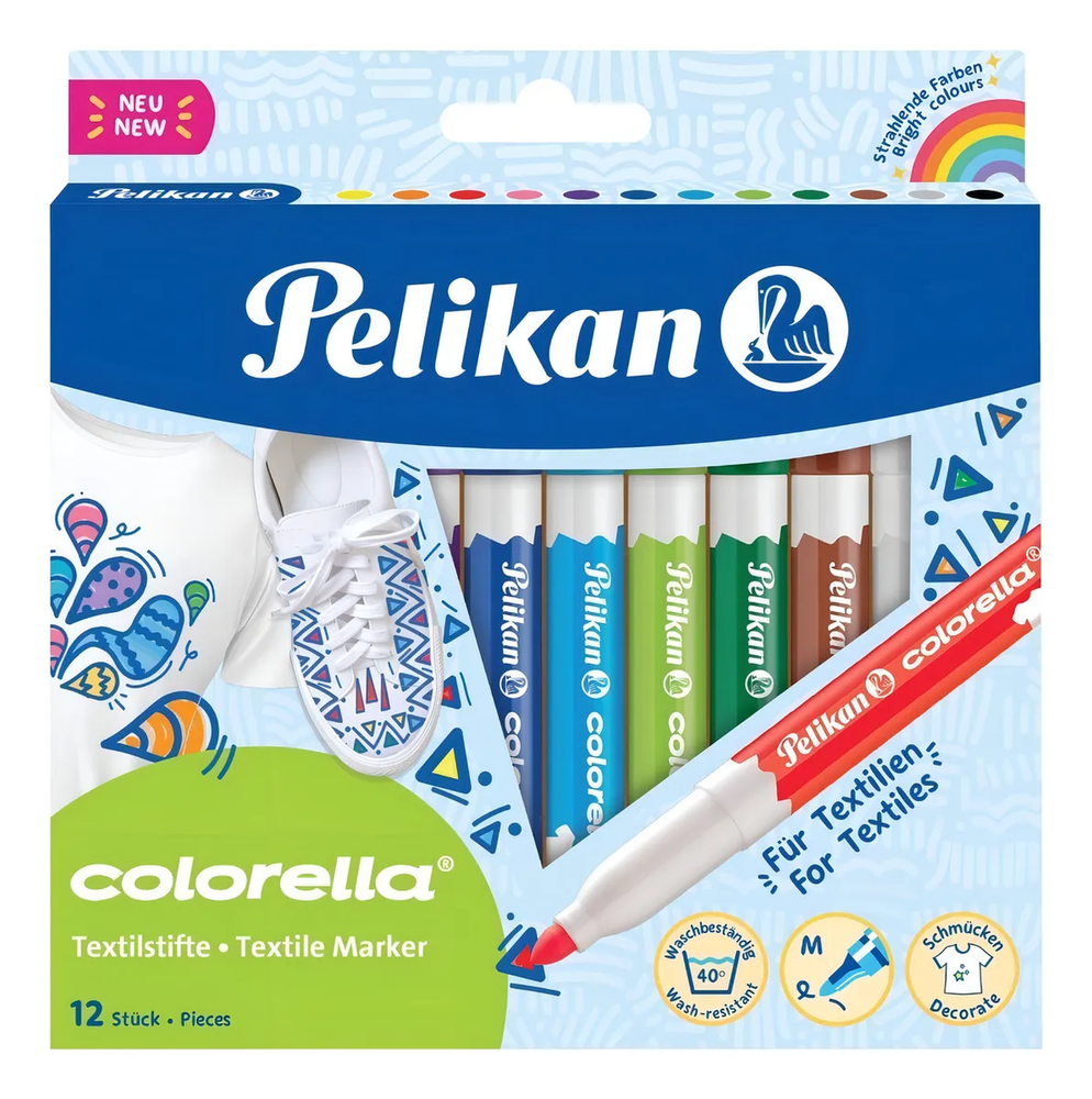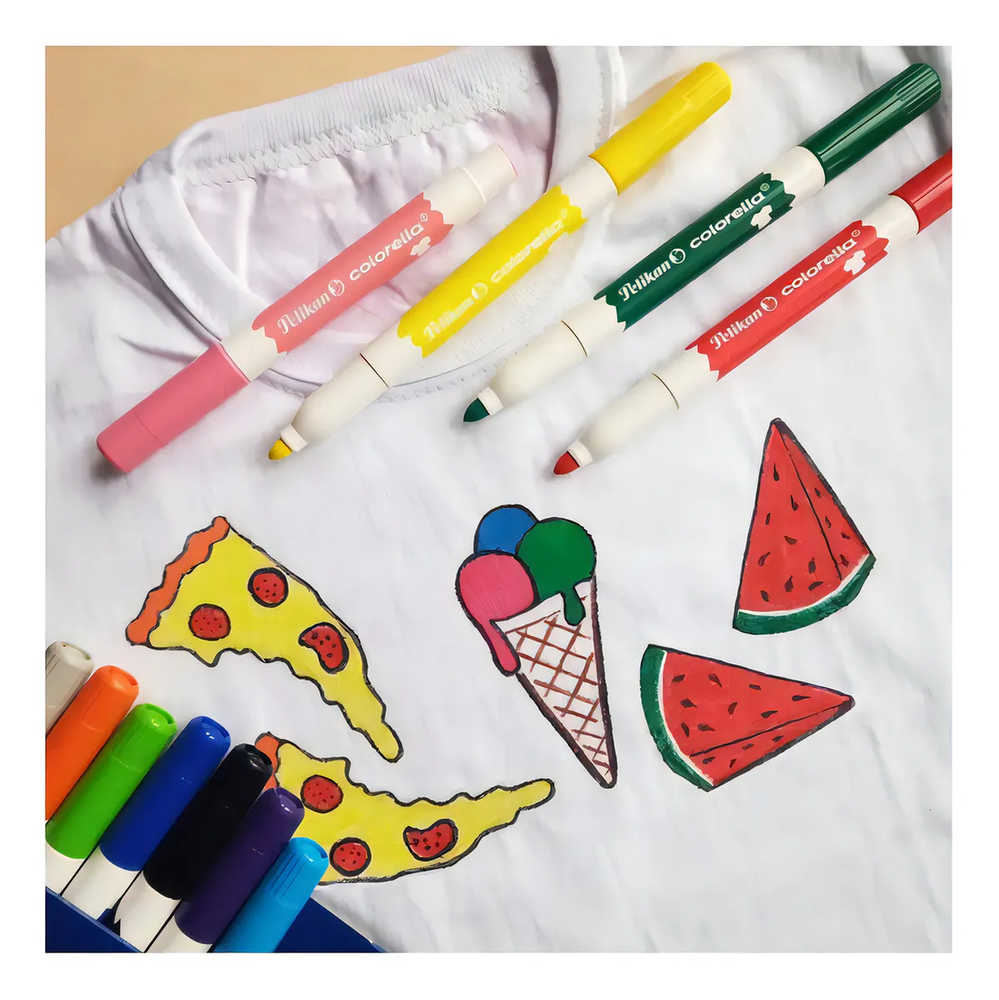 MARCADOR PARA TELA PELIKAN X 12 COLORELLA PUNTA CONICA trazo MEDIUM RESISTENTE AL LAVADO hasta 40 grados MODO DE USO: 1. DIBUJA SOBRE TELAS COMO ALGODÓN. 2. PLANCHAR DEL REVES PARA QUE SE FIJE EL DISEÑO Y LISTO!