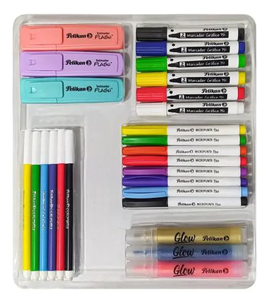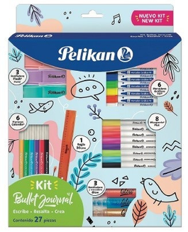El kit bullet journal contiene: 3 resaltadores, 8 Micropuntas colores, 3 Marcadores resaltador colores con escarcha, 6 Marcadores gráfico colores, 6 Plumones colores y 1 Regla de 30 cm Escribe, resalta y crea Cantidad de Piezas en el estuche: 27