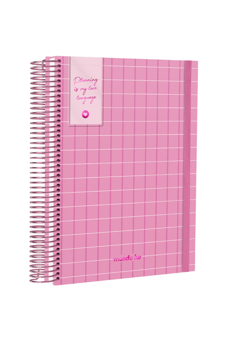 Cuaderno A5 tapa dura potenciado con tecnolgia inifity book con interior rayado. Tiene detalles en laca UV y hot stamping que destacan su diseño. Incluye sobre interior para guardar papeles, hojas con borde en tres colores y secciones de información y datos importantes. Cuenta con planner anual y semanal.