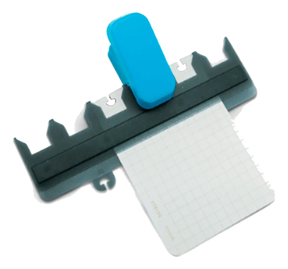 • EL blister aparte de la abrochadora trae una regla de posicionamiento de plastico para una correcta distancia entre perforaciones.